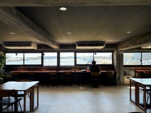 焼津PORTERSは、漁具倉庫をリノベーションした施設で、フードコート、コワーキングスペース、テナント、宿泊施設があり、その真ん中にあるコミュニティスペースでつながり、地域住民や学生、子育て世代、市内事業者など、様々な人たちのたまり場的スペースとなっています。また、宿泊施設を利用する観光客や市外の事業者、ワーケーションでスペースを活用する人など、多様な人々の居場所や交流の場ともなっています。漁具倉庫の形を活かしたリノベーションは、古さと新しさの両方を感じることができ、落ち着いた空間となっていました。また、そこで働く人も生き生きとして、この場所と空間を楽しんでいる感じが伝わってきました。福生市にも、米軍ハウスや古民家などの資源がありますが、まだまだ活かせる道があるのではないかと思いました。