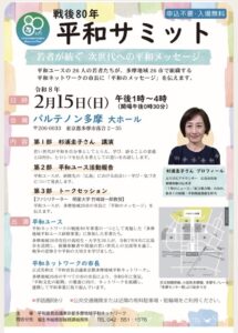 2月15日、「戦後80年 平和サミット 若者が紡ぐ次世代への平和メッセージ」が、多摩市にあるパルテノン多摩大ホールで開催されました。